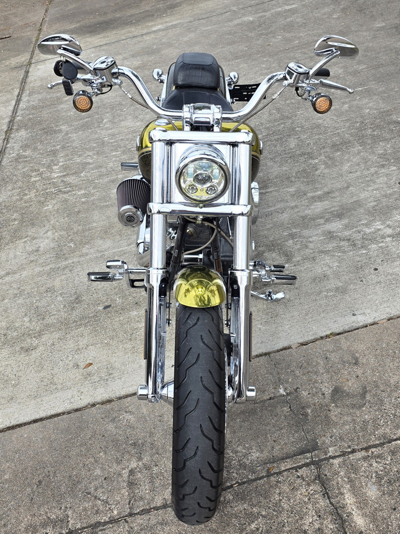 The wide front end spreads the forks approximately 1.75 inches wider than previous FX Softail® models, allowing fitment of a 130mm front tire. The entire front end assembly carries full chrome plating throughout — including the nacelle and headlamp bucket — for a front profile that commands attention at every stop.