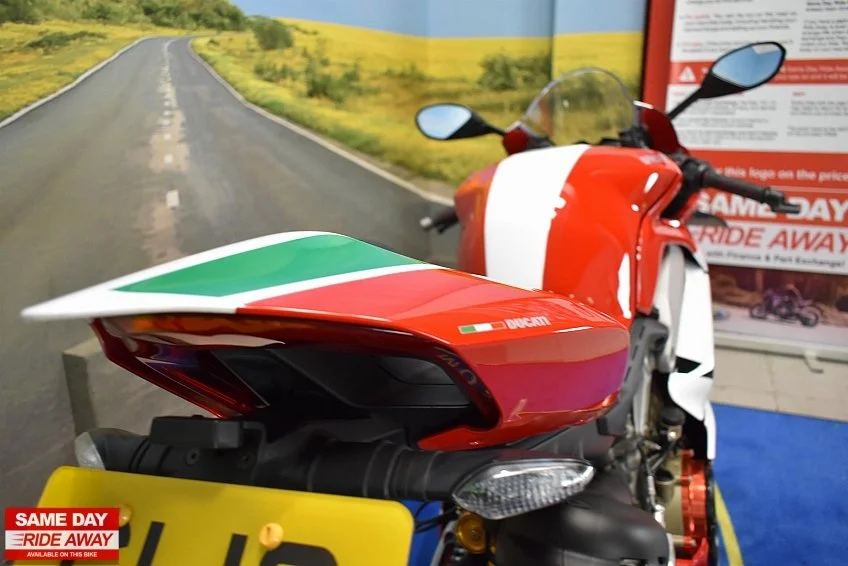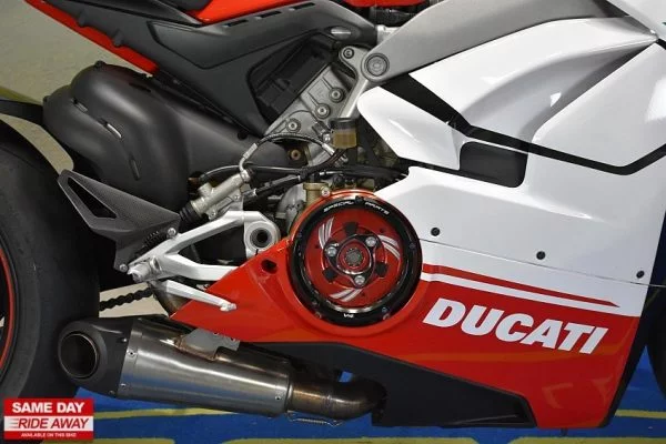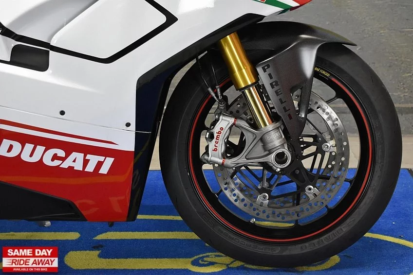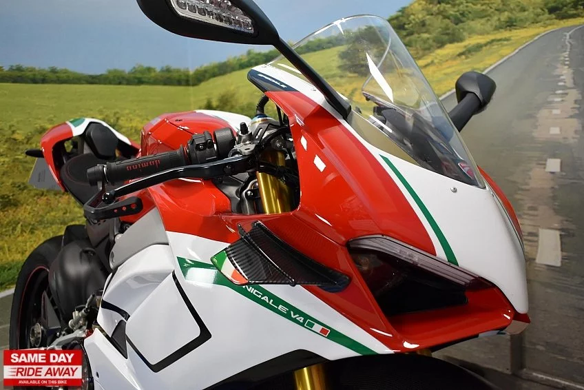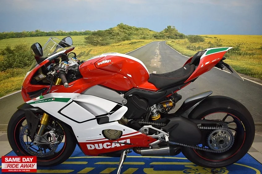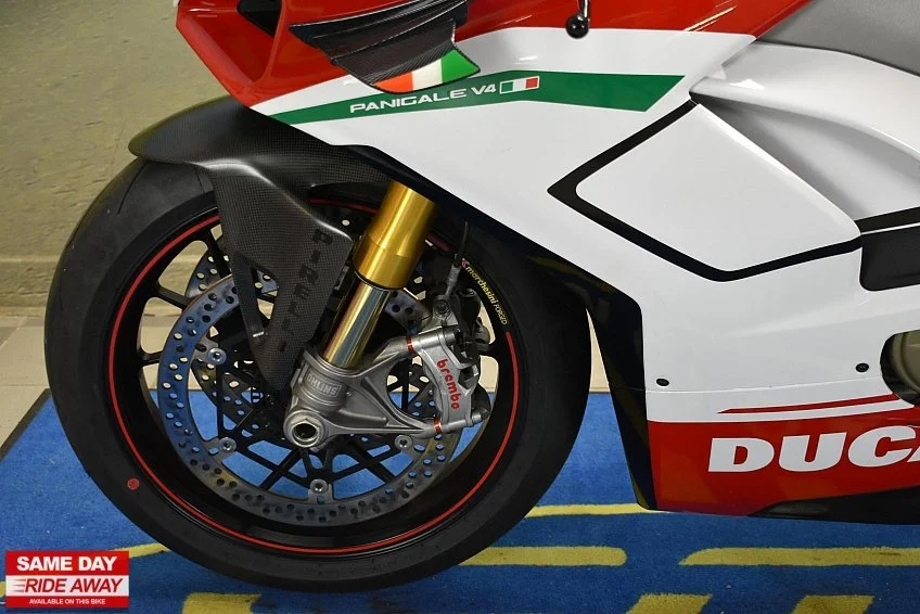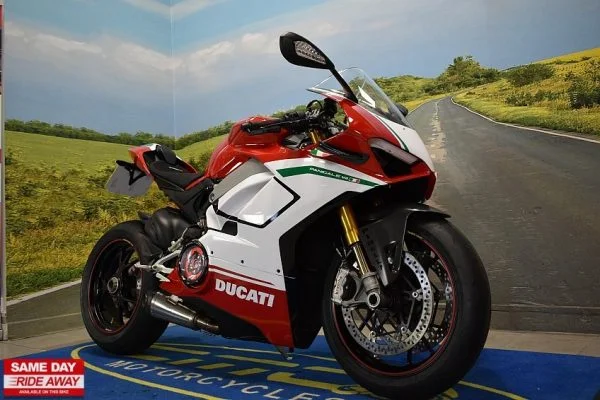 Firstkings Motorcycles have this awesome 2018 Ducati Panigale V4 S in stock, a masterpiece of Italian engineering and the epitome of high-performance sport bikes. Experience the thrill of racing on the streets with this exceptional two-wheeled marvel. At its heart lies a blistering 1103cc V4 engine, producing jaw-dropping power and an intoxicating exhaust note that commands attention.